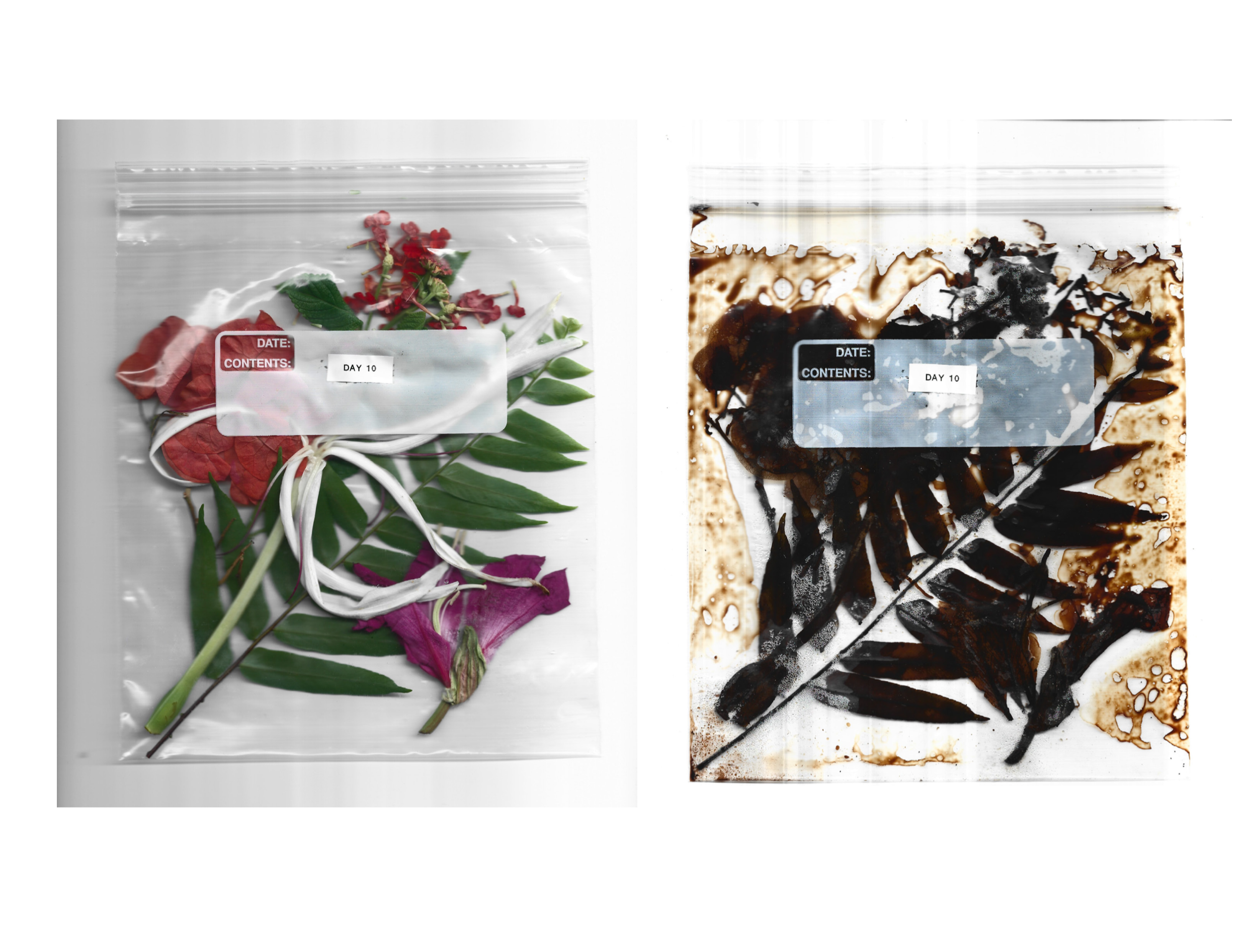 During a two week mandate quarantine in a hotel at the Cayman Islands, artist Grace Denis (Los Angeles, 1990) found herself with the unique chance to develop ‘Quarantine Diary’, a study of the environment through the documentation of elements and specimens from the outside world. Thus, samples of sand, flowers, plants, dirt or ocean water were collected and delivered by external figures who became essential parties of the project, unintentionally fostering a heightened sense of attention to their peripheral surroundings. As the artist herself states, ‘Quarantine Diary’ reflects on the notion of time through organic material and its gradual degradation, therefore «illustrating time in its innately entropic state.»